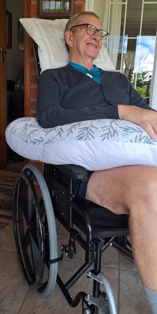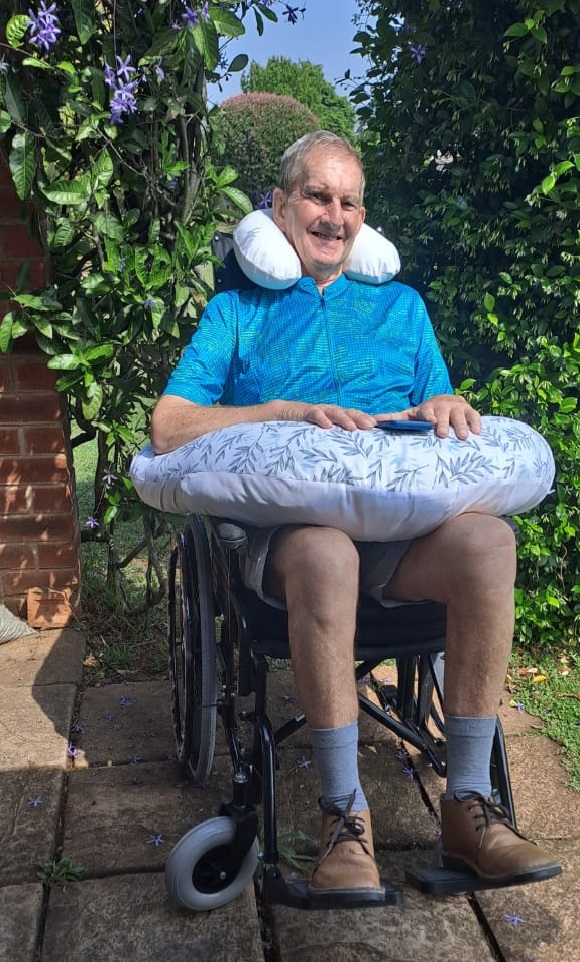 Ian is finding the wheelchair with a headrest to be comfortable and is actually enjoying it. As Ian cannot use his arms to propel it, Fiona pushes him where he needs to be or wants to be.